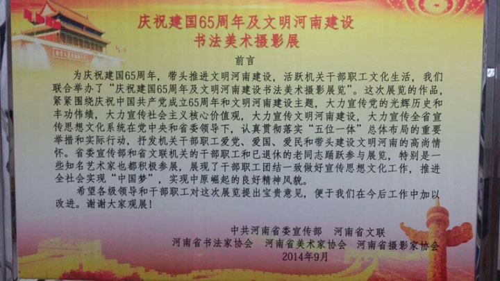 為慶祝中華人民共和國成立65周年,大力宣傳社會主義核心價值觀,豐富廣大黨員干部職工的精神文化生活,抒發(fā)機關干部職工愛黨、愛國、愛民和帶頭建設文明河南的高尚情懷,展現機關干部職工團結一致做好思想文化工作的精神風貌,為打造“四個河南”推進“兩項建設”、加快中原崛起河南振興富民強省唱響主旋律、凝聚正能量,河南省委宣傳部、河南省文聯、河南省美術家協、河南省書法家協會、河南省攝影家協會聯合舉辦的“慶祝建國65周年及文明河南建設書畫攝影展”,于2014年9月28日在省委辦公樓拉開序幕,本次展覽將持續(xù)一個月左右。